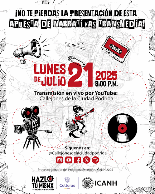 El proyecto "Hazlo Tú Mismx: Autogestión, cultura y re-existencia" traduce la tesis "Kaos en el sótano: Génesis y estructura de la escena Punk Medallo (1985-2018)" escrita por Ricardo Gómez a formatos accesibles y participativos a través de estrategias transmedia que incluyen eventos educomunicativos, contenidos digitales interactivos, capsulas audiovisuales documentales, podcast seriado, archivos colaborativos (fotos y fanzines) y una plataforma web. Esta iniciativa representa la primera sistematización y socialización de 40 años de punk en Medellín, visibilizando una historia cultural que demuestra cómo la autogestión y la resistencia han construido formas alternativas de hacer cultura, educación y territorio desde los márgenes urbanos cuestionando la sociedad del consumo y las lógicas del mercado.